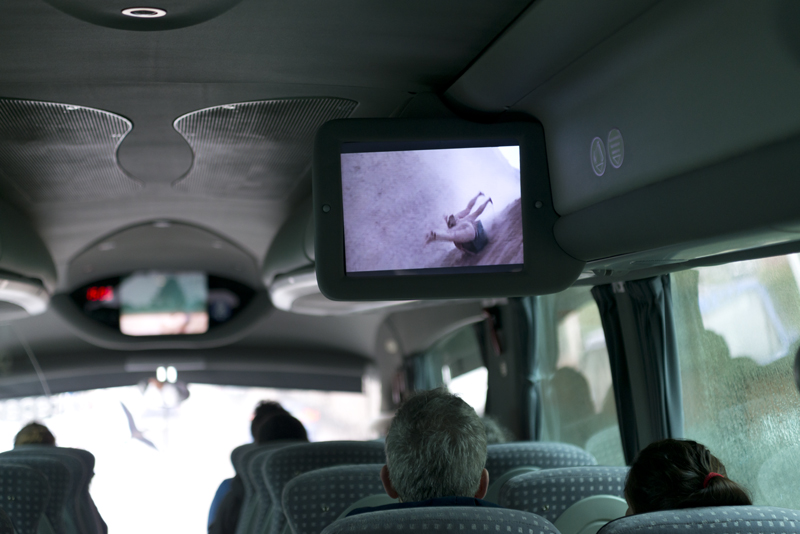 El cementerio pasa en travelling mientras en las pantallas del bus unos jóvenes retozan y ruedan en el Valle de la Muerte.